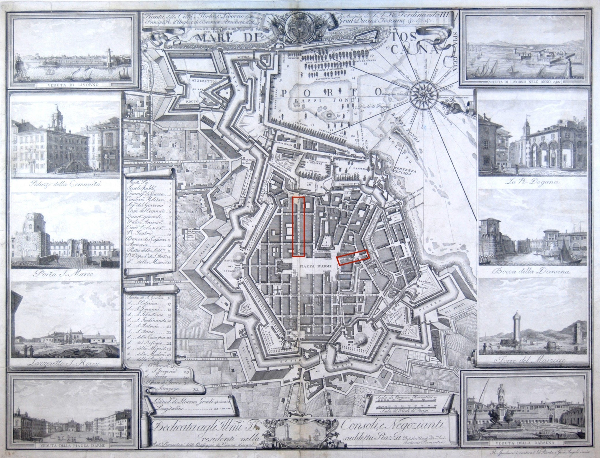 Antonio Piemontesi, Map of Livorno (Print of 1791-1799), with highlighted the streets where the two hotels were located